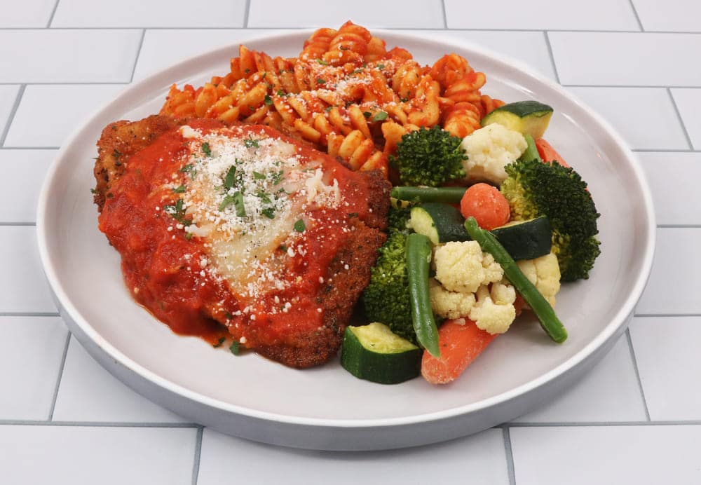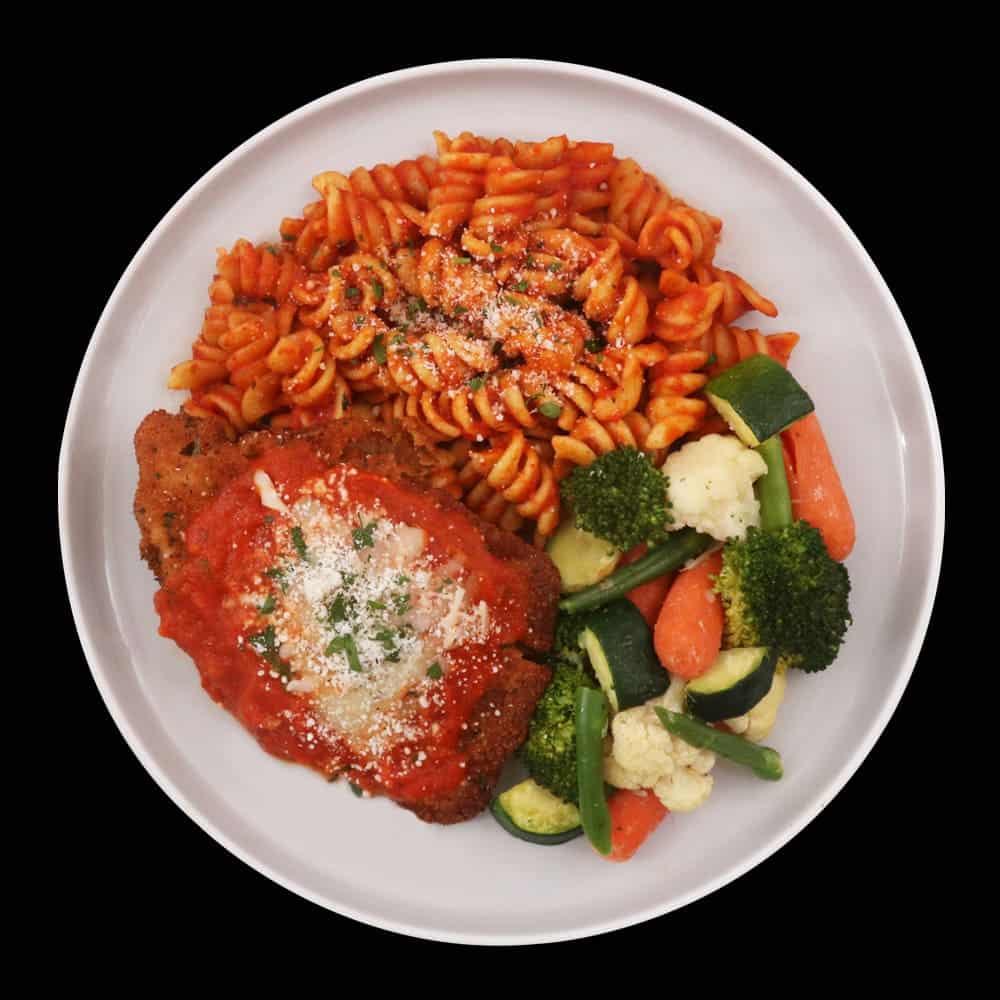 Italian Blend [Cauliflower [Cauliflower, Blended Oil [SOY Bean Oil, Extra Virgin Olive Oil], Seasoning Vegetable [Garlic Powder (48.9%), Onion Powder (48.9%), Parsley (1.5%), Black Pepper (0.73%)], Salt], Carrots [Carrots, Honey], Green Beans, Zucchini [Zucchini, Blended Oil [SOY Bean Oil, Extra Virgin Olive Oil], Seasoning Vegetable [Garlic Powder (48.9%), Onion Powder (48.9%), Parsley (1.5%), Black Pepper (0.73%)], Salt], Broccoli [Broccoli, Blended Oil [SOY Bean Oil, Extra Virgin Olive Oil], Garlic Powder, Salt, Black Pepper], Garlic], Chicken Parmesan [Chicken, Gluten Free Bread Crumbs [Rice Flour, Water, Salt, Yeast], EGGS, Bob’s Red Mill Gluten Free All Purpose Baking Flour [Garbanzo Bean Flour, Potato Starch, Tapioca Flour, Whole Grain Sorghum Flour, Fava Bean Flour], Blended Oil [SOY Bean Oil, Extra Virgin Olive Oil], Salt, Basil, Oregano, Parsley], Rotini With Marinara [Rotini Pasta [SEMOLINA (WHEAT, GLUTEN), NIACIN, FERROUS SULFATE (IRON), THIAMIN MONONITRATE, RIBOFLAVIN, FOLIC ACID ], Blended Oil [SOY Bean Oil, Extra Virgin Olive Oil]], Marinara [Tomato, Onions, Olive Oil, Tomato Paste, Garlic, Salt, Basil, Sugar, Oregano, Crushed Red Pepper], Mozzarella Cheese (MILK), Parmesan Cheese (MILK)