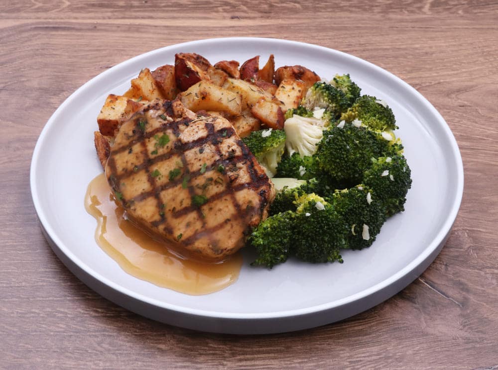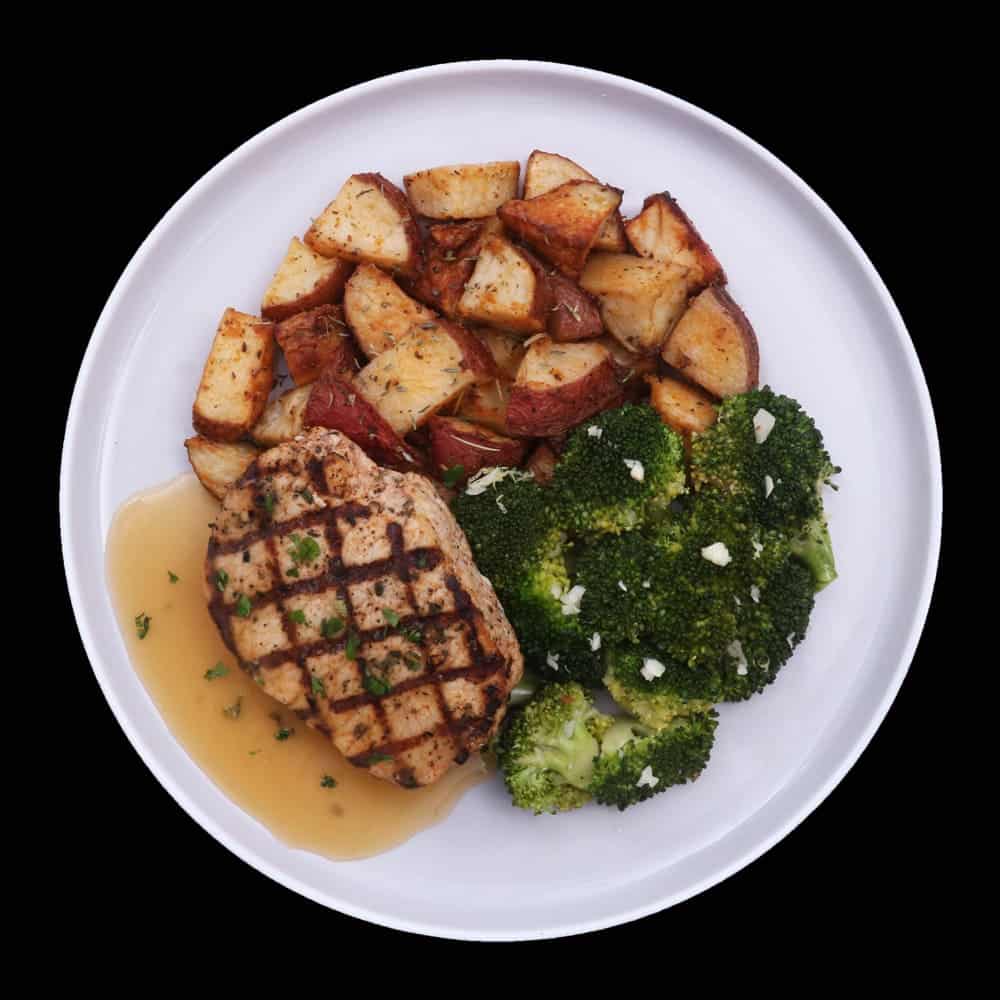 Pork Chop [Pork Loin, Blended Oil [SOY Bean Oil, Extra Virgin Olive Oil], Garlic Powder, Dried Rosemary, Thyme, Paprika, Black Pepper, Salt], Broccoli [Broccoli, Blended Oil [SOY Bean Oil, Extra Virgin Olive Oil], Garlic Powder, Salt, Black Pepper], Roasted Red Potatoes [Potatoes, Blended Oil [SOY Bean Oil, Extra Virgin Olive Oil], Seasoning Roasted Potato [Garlic Powder (33.3%), Onion Powder (33.3%), Paprika (16.7%), Basil (8.3%), Dried Rosemary (8.3%)], Salt], Pork Sauce [White Wine, Pork Stock [Water, Tomato Puree, Onions, Pork, Celery, Carrots, Salt, Sugar, Thyme, Bay Leaf], Apple Juice, Corn Starch, Chicken Base, Butter (MILK), Shallots, Garlic, Thyme, White Pepper, Sugar, Gravy Master [Caramelized Sugar, Caramel Color, Water, Hydrolyzed SOY & Corn Protein, Apple Cider Vinegar, Salt, Spices (Onion, Celery, Parsely, Garlic)]]