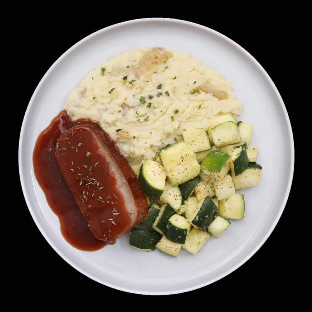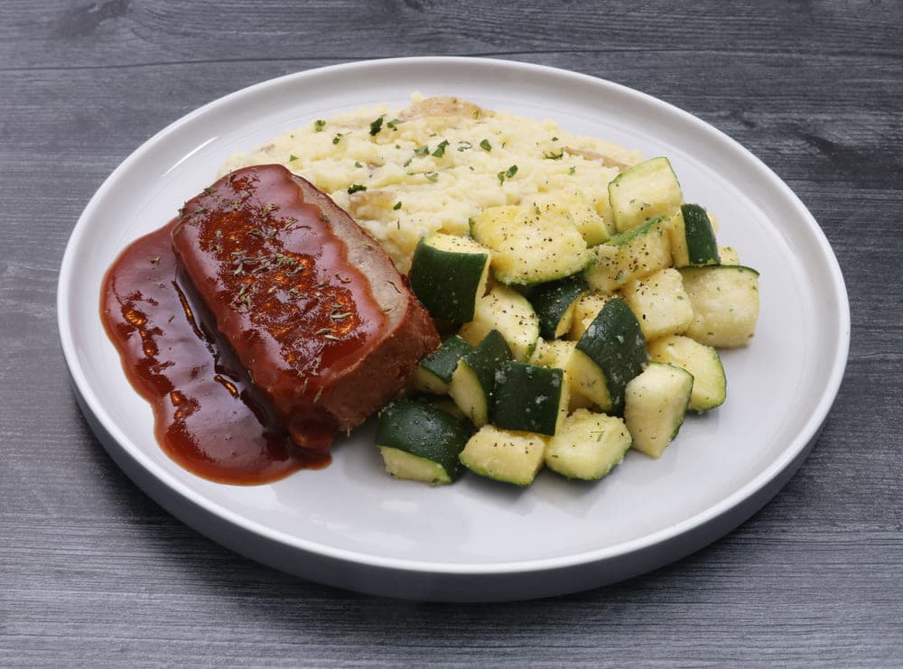 Italian Blend [Cauliflower [Cauliflower, Blended Oil [SOY Bean Oil, Extra Virgin Olive Oil], Seasoning Vegetable [Garlic Powder (48.9%), Onion Powder (48.9%), Parsley (1.5%), Black Pepper (0.73%)], Salt], Carrots [Carrots, Honey], Green Beans, Zucchini [Zucchini, Blended Oil [SOY Bean Oil, Extra Virgin Olive Oil], Seasoning Vegetable [Garlic Powder (48.9%), Onion Powder (48.9%), Parsley (1.5%), Black Pepper (0.73%)], Salt], Broccoli [Broccoli, Blended Oil [SOY Bean Oil, Extra Virgin Olive Oil], Garlic Powder, Salt, Black Pepper], Garlic], Yukon Mashed Potatoes [Potatoes, MILK, Butter Blend [Butter (MILK), SOY Bean Oil], Salt, Black Pepper], Meatloaf [Beef, EGGS, Onions, Ketchup [Tomato Concentrate, (Water, Tomato Paste), Sugar, Distilled Vinegar, Salt, Onion Powder, Spice, Natural Flavor], Gluten Free Bread Crumbs [Rice Flour, Water, Salt, Yeast], Molasses, Worcestershire Sauce [Distilled White Vinegar, Molasses, Sugar, Water, Salt, Onions, Anchovies (FISH), Garlic, Cloves, Tamarind Extract, Natural Flavorings, Chili Pepper Extract], Brown Sugar, Beef Base, Parsley, Garlic], Sauce [Water, Ketchup [Tomato Concentrate, (Water, Tomato Paste), Sugar, Distilled Vinegar, Salt, Onion Powder, Spice, Natural Flavor], Tomato Puree, Brown Sugar, Beef Demi Glace [Beef Stock (Made From Filtered Water, Roasted Beef Bones, Onions, Celery, Leeks, Carrots, Tomato Paste, Red Wine (Sulphites), Parsley, Thyme, Garlic, Peppercorns, Cloves And Bay Leaves)], Corn Starch, Beef Base, Molasses]