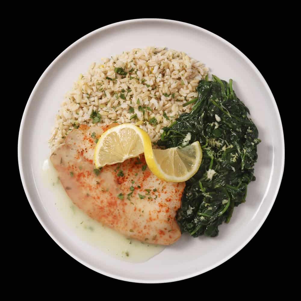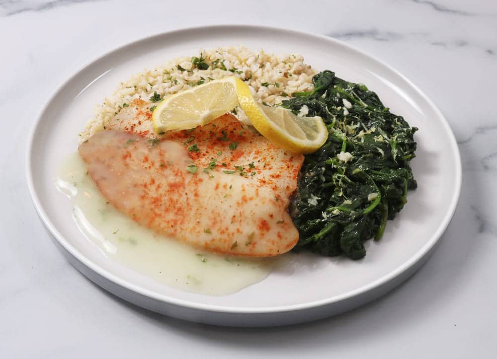 Pan seared tilapia finished with a white wine, lemon sauce. Served with white rice and spinach.