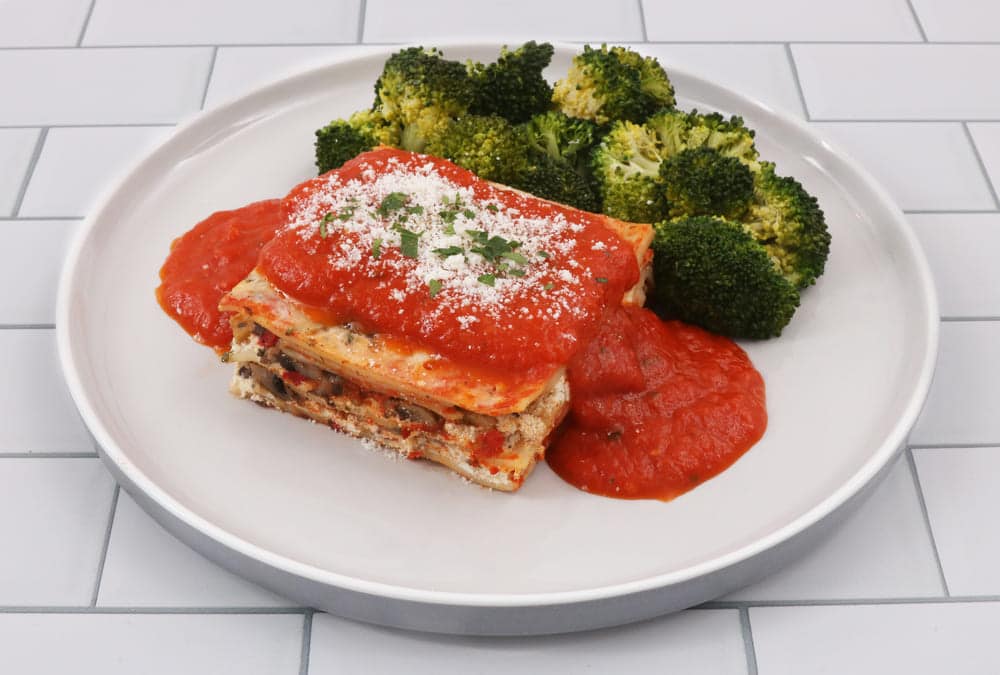 Vegetable Lasagna [Lasagna Noodle [Enriched Extra Fancy Durum Flour (Durum WHEAT Flour, Niacin, Ferrous Sulfate, Thiamine Mononitrate, Riboflavin, Folic Acid, WHEAT), Water], Ricotta Cheese (MILK), Marinara [Tomato, Onions, Olive Oil, Tomato Paste, Garlic, Salt, Basil, Sugar, Oregano, Crushed Red Pepper], Zucchini, Yellow Squash, Eggplant, Mushrooms, Mozzarella (MILK), EGGS, Parmesan Cheese (MILK), Red Pepper, Parsley, Basil, Oregano, Black Pepper], Broccoli [Broccoli, Blended Oil [SOY Bean Oil, Extra Virgin Olive Oil], Garlic Powder, Salt, Black Pepper], Marinara [Tomato, Onions, Olive Oil, Tomato Paste, Garlic, Salt, Basil, Sugar, Oregano, Crushed Red Pepper], Parmesan Cheese (MILK)